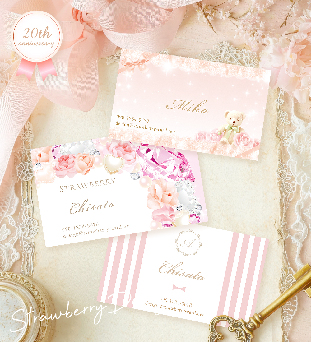 ストロベリーデザインは、ガラケー時代より20年以上続く『かわいい名刺専門店』です。現在ではチラシ印刷、ホームページ作成、ロゴ制作、ディプロマ発行など、オリジナルのおしゃれな販促品も豊富に取り揃えています。累計3万件以上の実績を誇り、個人経営ならではの低価格で、多くのショップやサロンの販促をサポートしています。